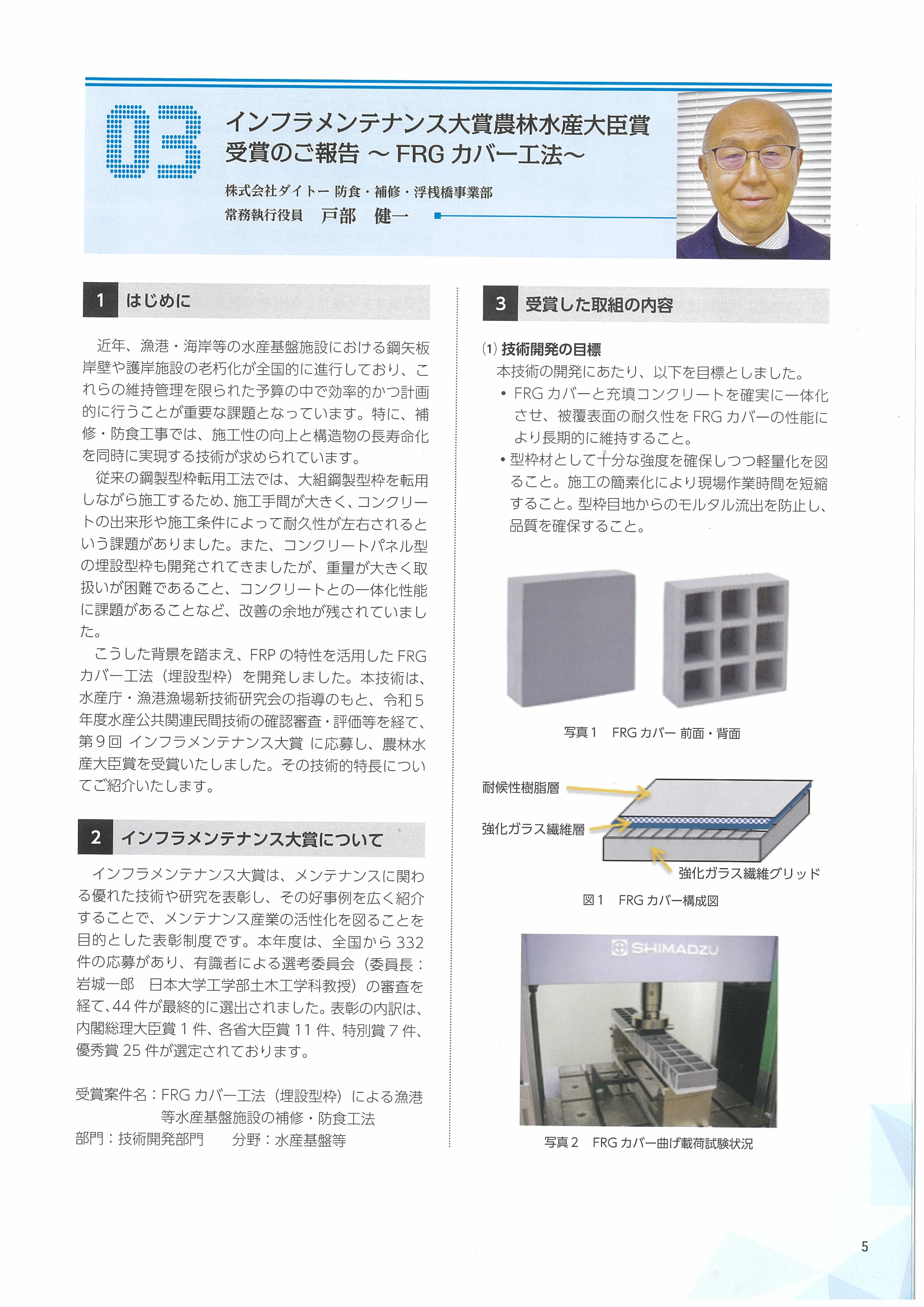一般社団法人 漁港漁場新技術研究会 新技術通信にインフラメンテナンス大賞受賞の掲載